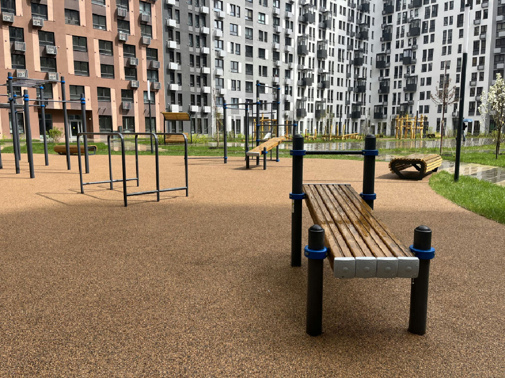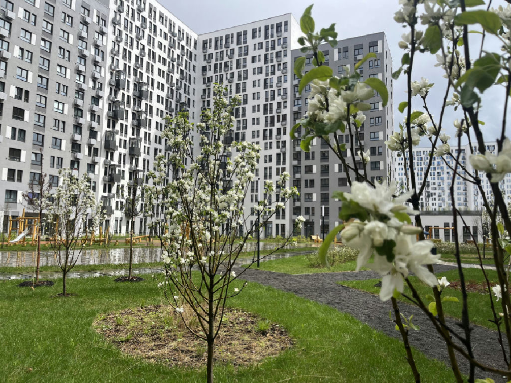 6. Закрытый, приватный, просторный двор с детскими площадками и цветущими деревьями. Двор без машин.